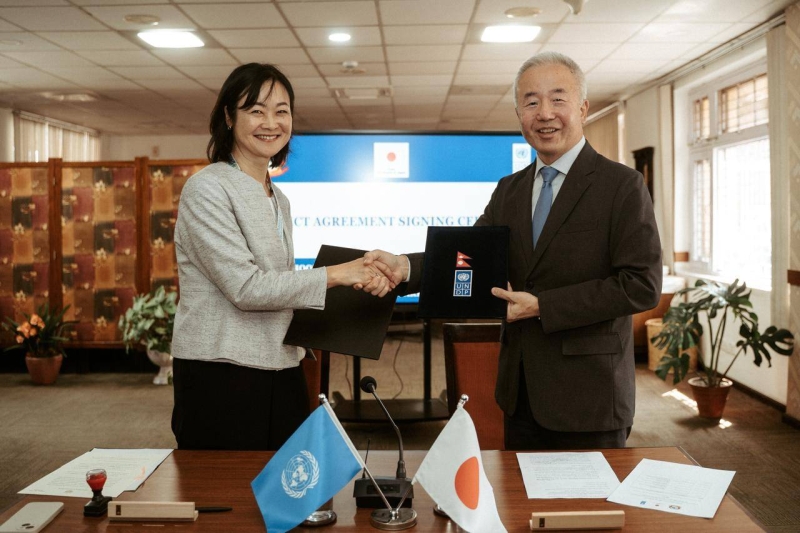 The Embassy of Japan and the United Nations Development Programme (UNDP) Nepal have signed an agreement that the Government of Japan will extend grant assistance to the UNDP for the implementation of the Project for the Livelihoods Improvement and Disaster Resilience Enhancement in the Areas Affected by the Jajarkot Earthquake. The signing ceremony took place today at the UN House in Kathmandu.
